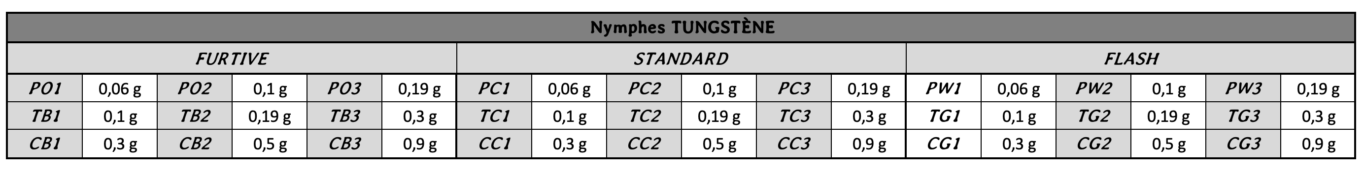 Poids et lestages de la collection Nymphévolution