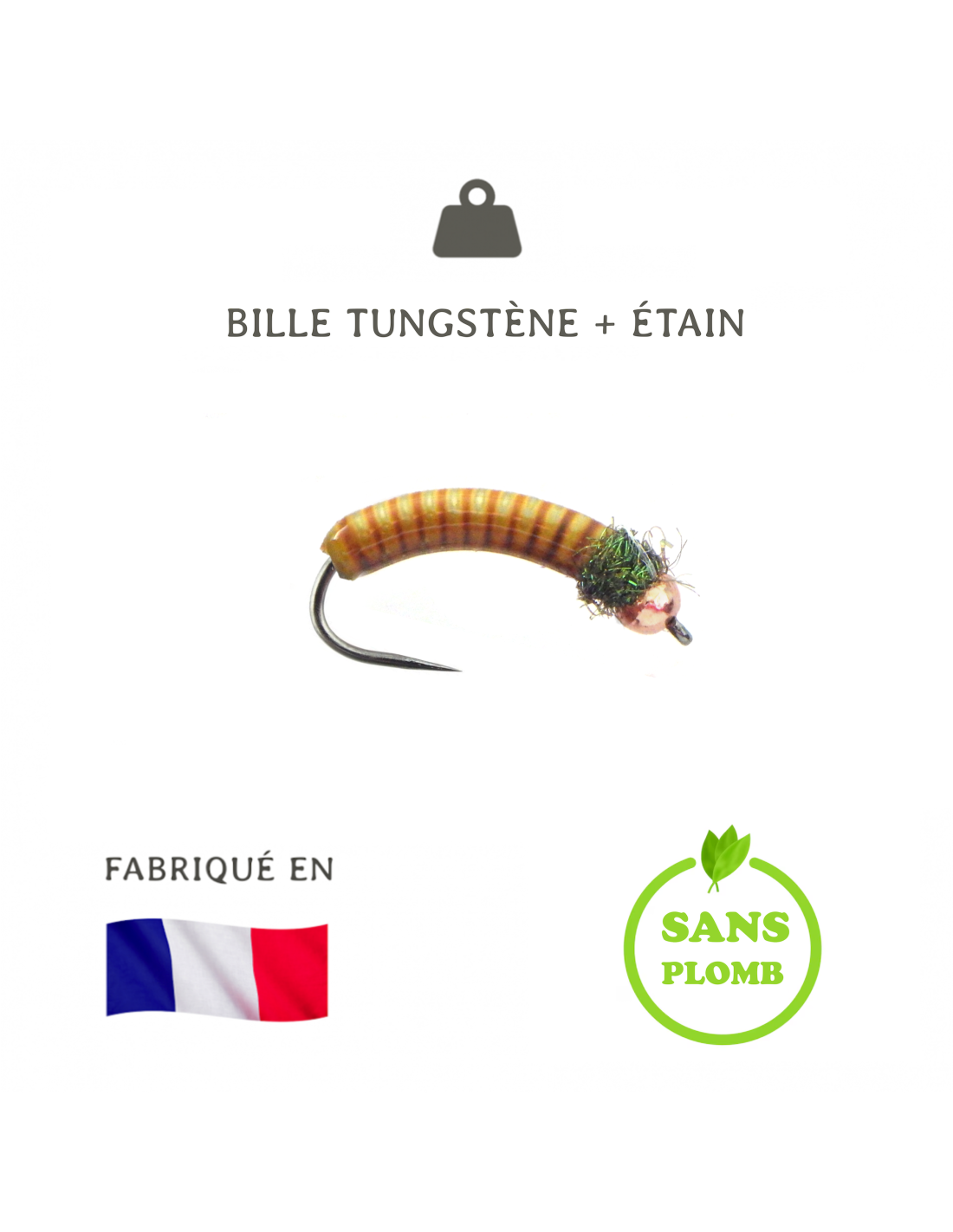 Its weighting (medium for its range) is made with a 3 mm diameter tungsten bead and varnished tin wire wraps.