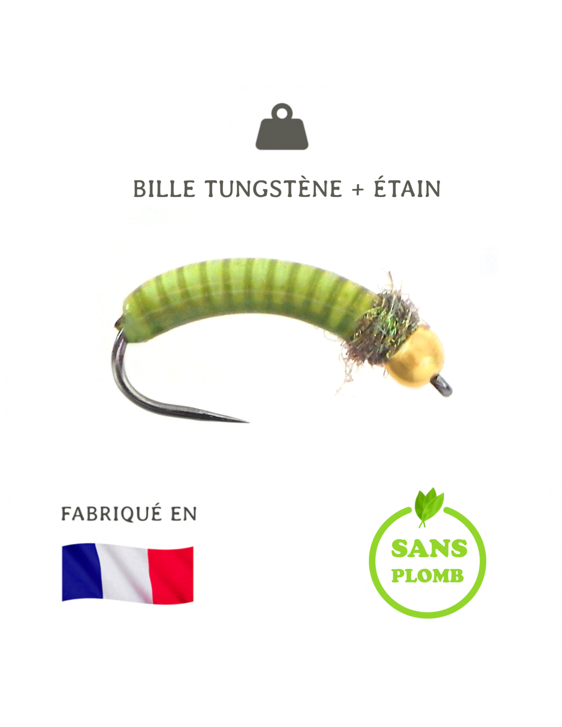 Its weighting (heavy for its range) is made with a 3.5 mm diameter tungsten bead and varnished tin wire wraps