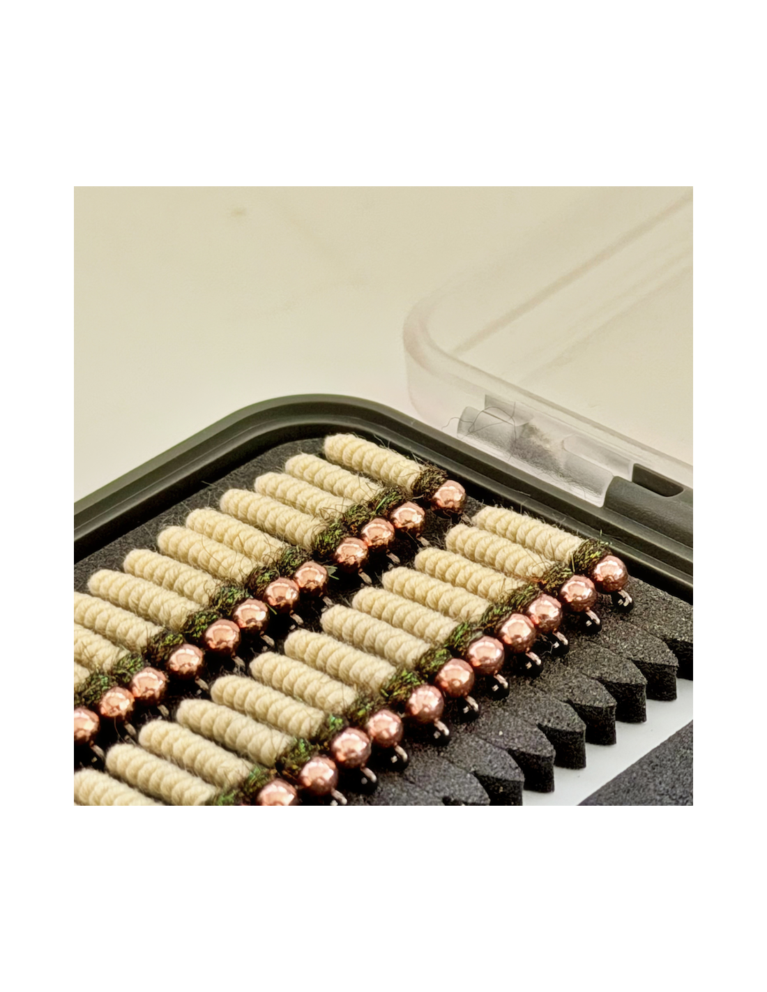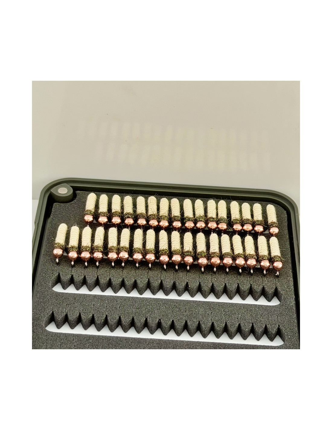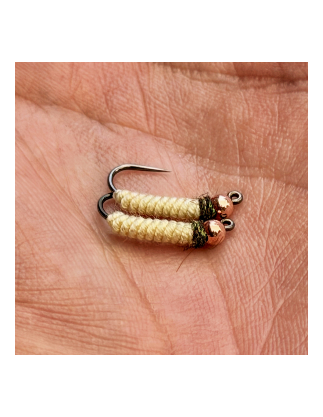 Monté sur hameçon droit jig pour reprendre la forme droite des trichoptères en fourreau.